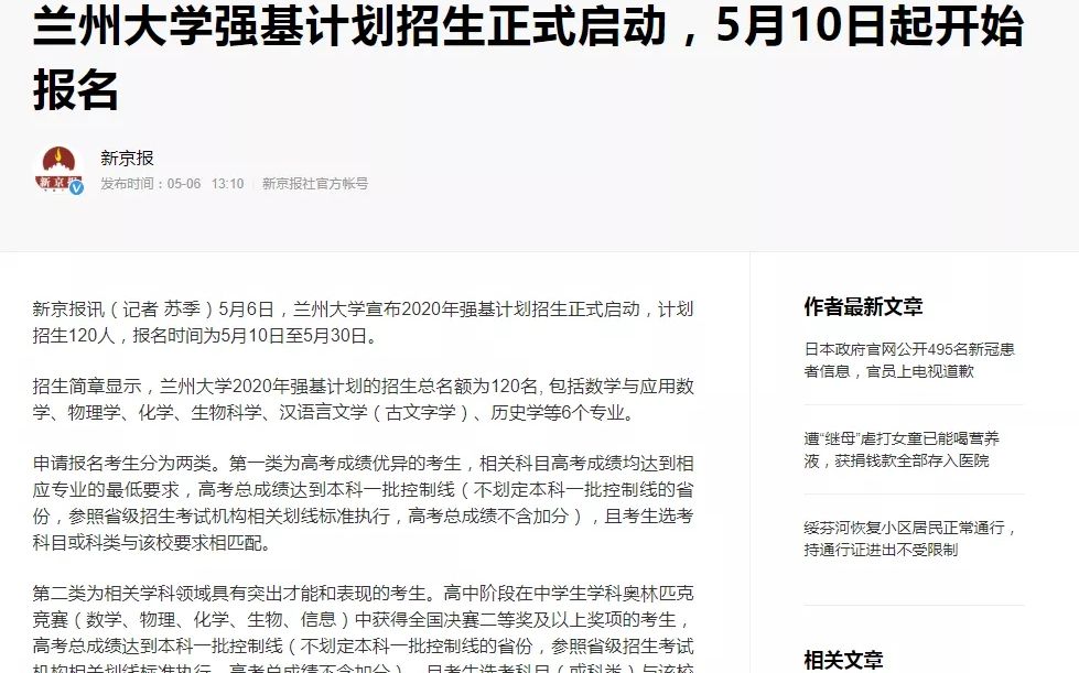 ▲兰州大学近日发布2020年强基计划招生简章。
