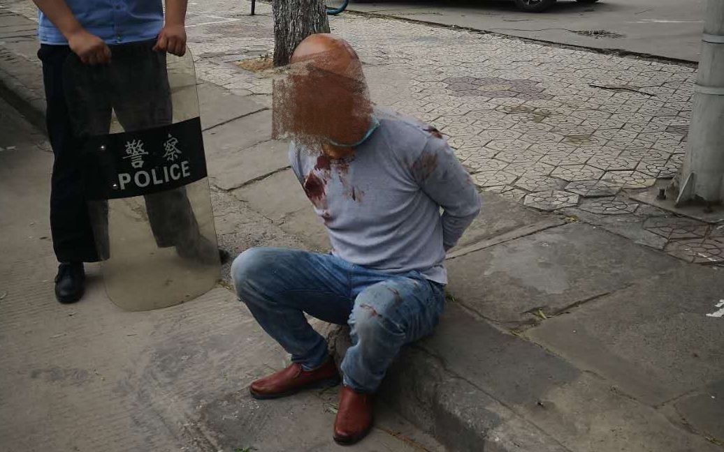 目击者提供的多段视频显示,在街边的一家轮胎店前,一名光头穿白衬衫男子持凶器扎刺坐在地上一名黑衣男子,旁边一名身穿白衬衫的女子抱着黑衣男子一直哭喊,但难以阻止伤人男子。
