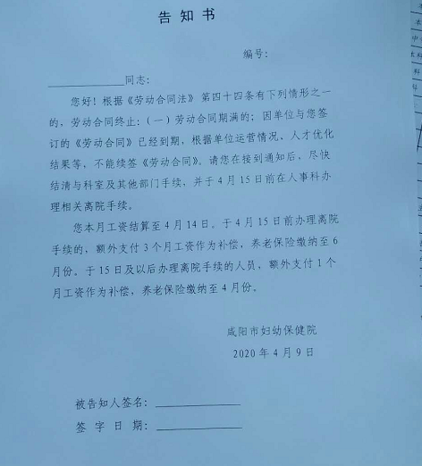 咸阳市妇幼保健院出具的告知书显示,以“人才优化”的名义裁掉40余名医护。 受访者供图