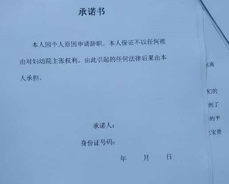 咸阳妇幼保健院一名涉事医护人员称,其2018年下半年首次跟医院签订劳动合同,为期一年,后再未签订任何合同,此次却被医院要求“自愿辞职”。新京报记者获得的一份《承诺书》显示,“被优化”人员要承诺“因个人原因申请辞职”。随后,新京报记者就上述“合同”一事致电咸阳妇幼保健院,医院办公室一名工作人员表示正在处理,暂不方便回应此事。