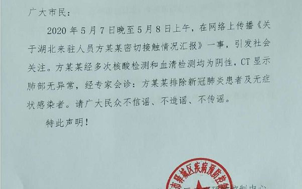 新京报记者于今日致电驻马店市驿城区新冠肺炎疫情防疫指挥部,工作人员表示,近期当地并未发现新确诊的新冠肺炎患者,网传图片内容不准确。据其提供给新京报记者的一份通告显示,方某某经多次核酸检测和血清检测均为阴性,CT显示肺部无异常。经专家会诊,方某某排除新冠肺炎患者及无症状感染者。