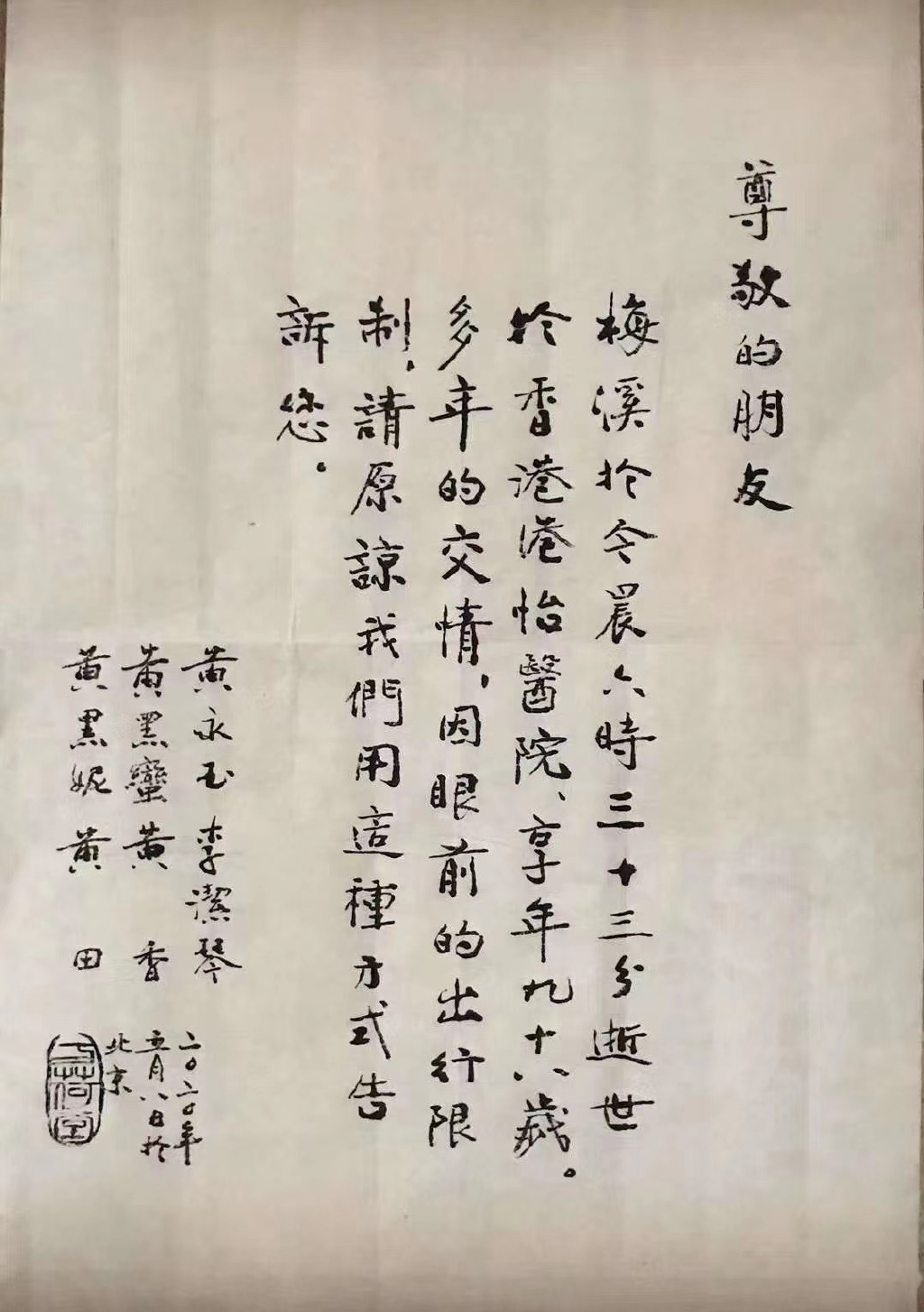 新京报讯(记者 吴龙珍)5月9日晚,据人民文学出版社官微消息,画家黄永玉的夫人张梅溪,于5月8日逝世于香港,享年98岁。黄永玉手书了讣告,向外公布了这一消息。