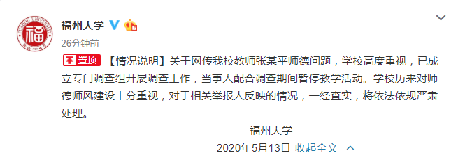 福州大学:针对网传教师张某平师德问题已展开调查