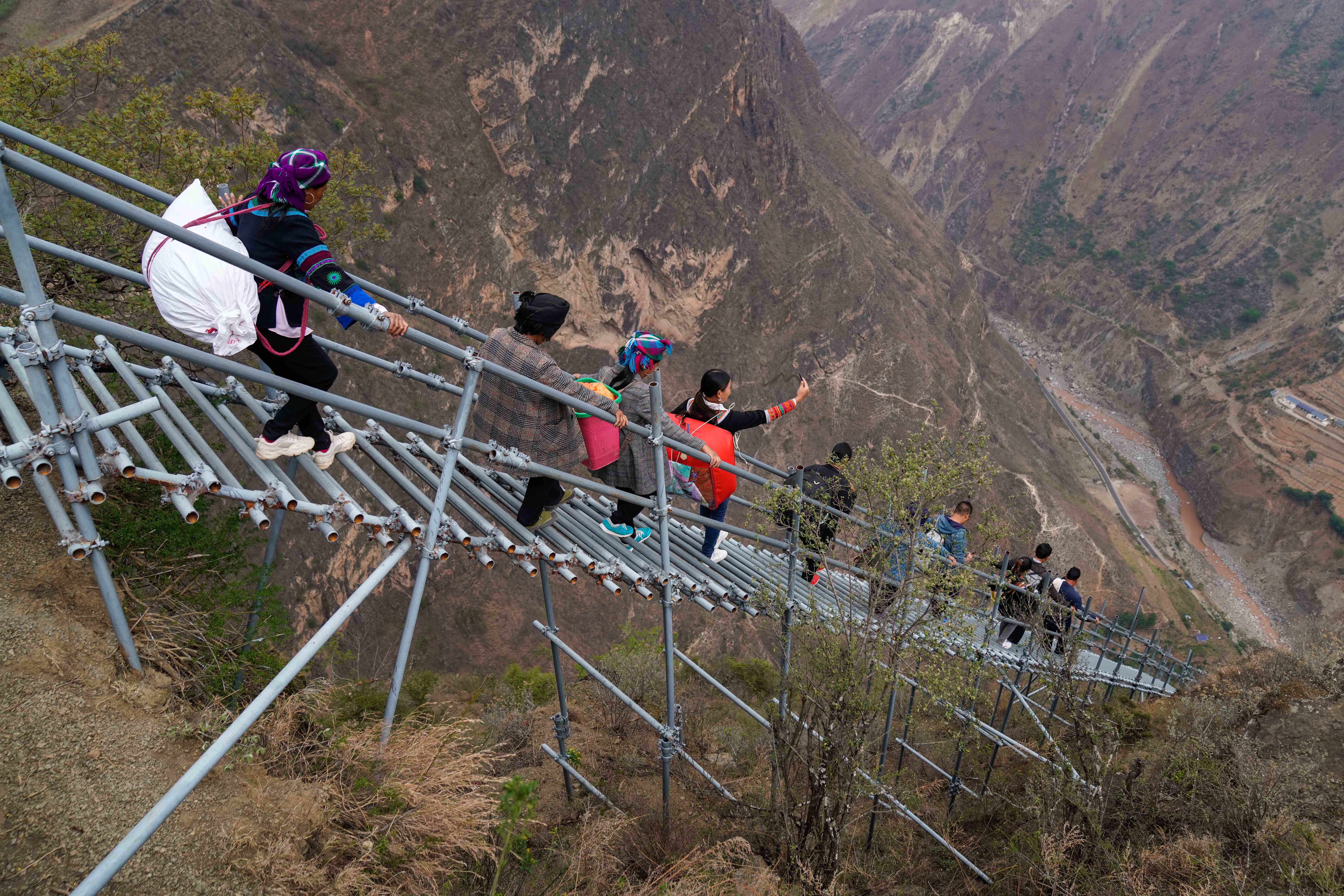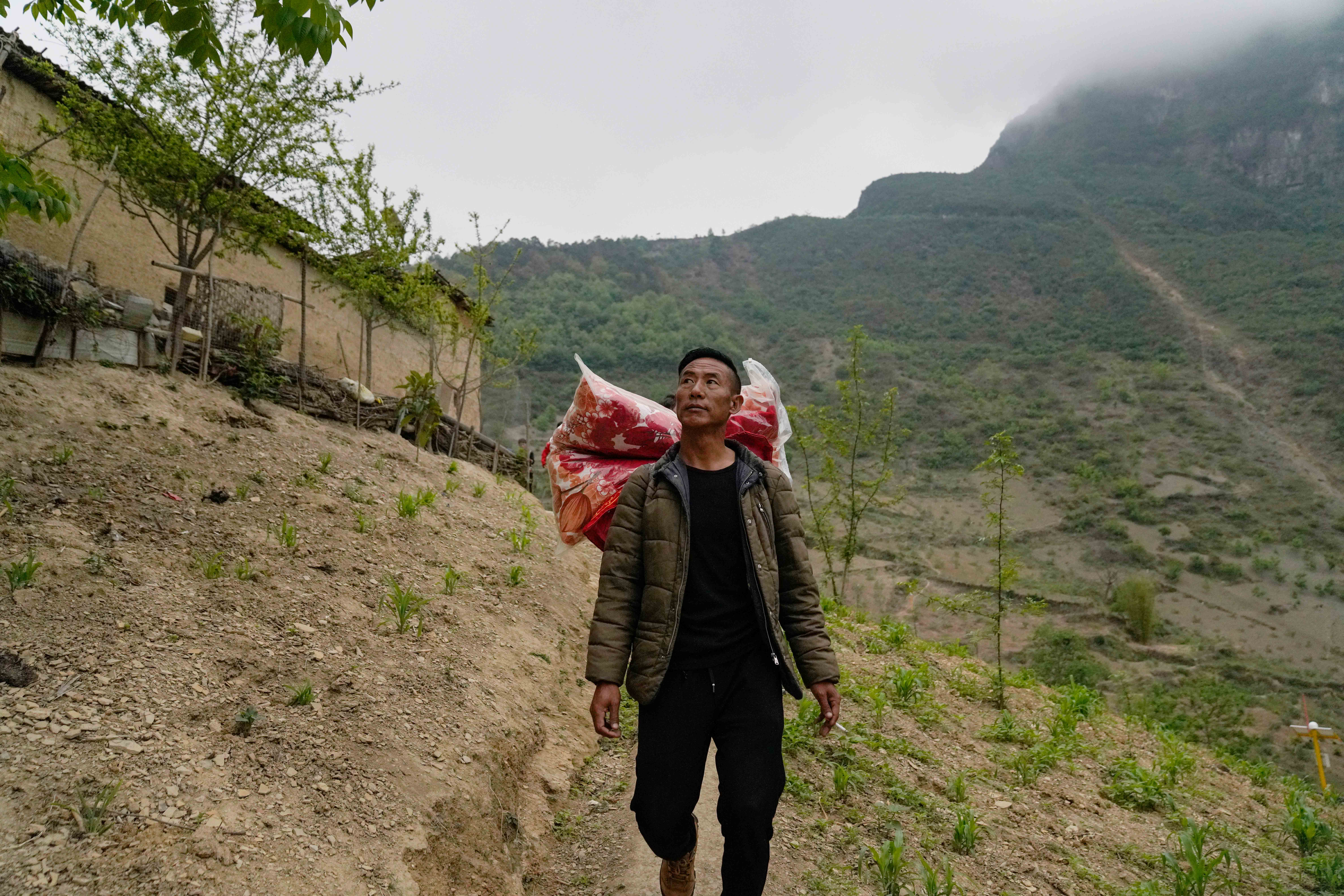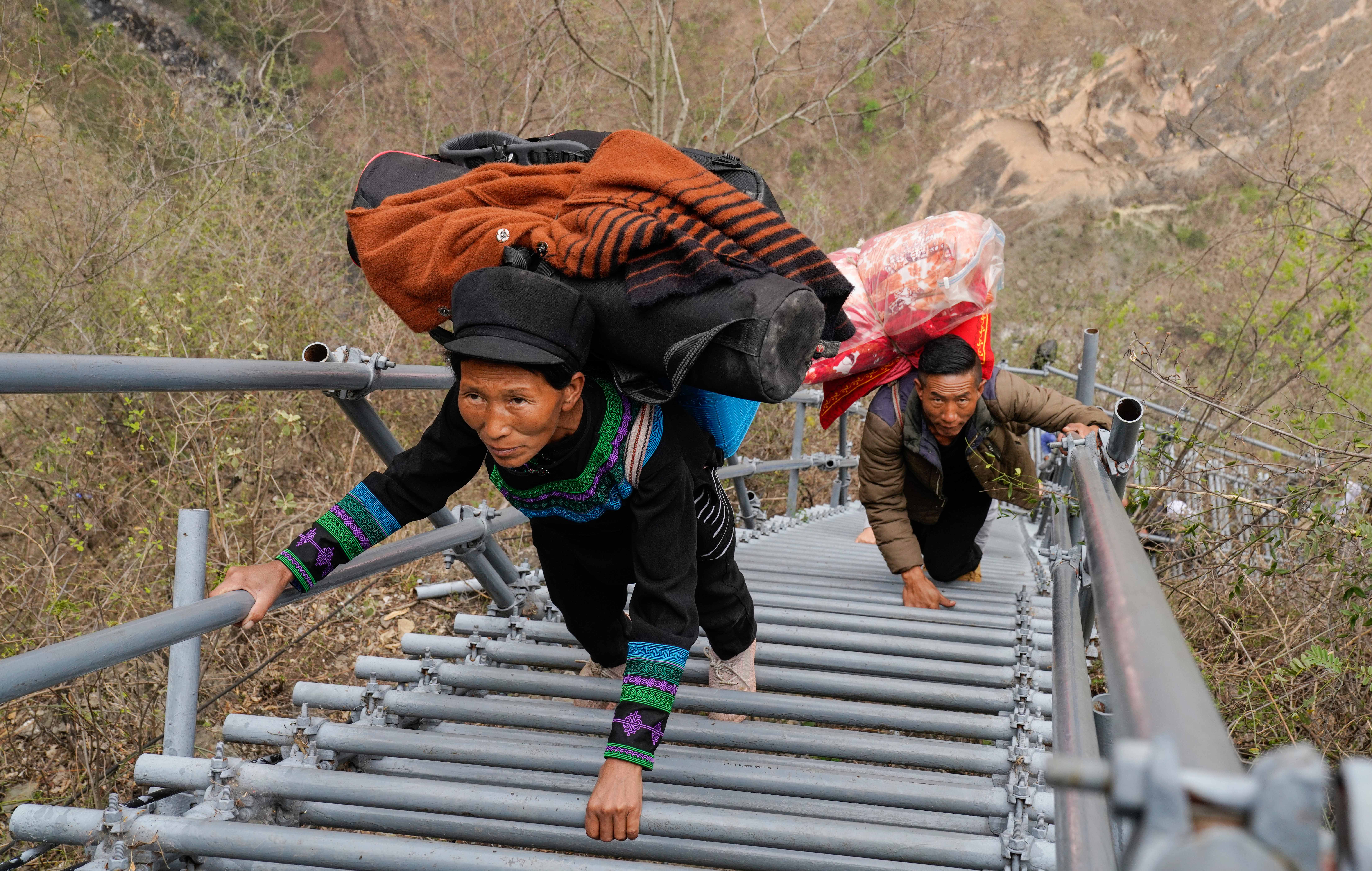 2020年5月13日,被称为“悬崖村”的四川省凉山州昭觉县的阿土列尔村,村民背负家当,沿着“天梯”下山,前往县城新居开启新生活。