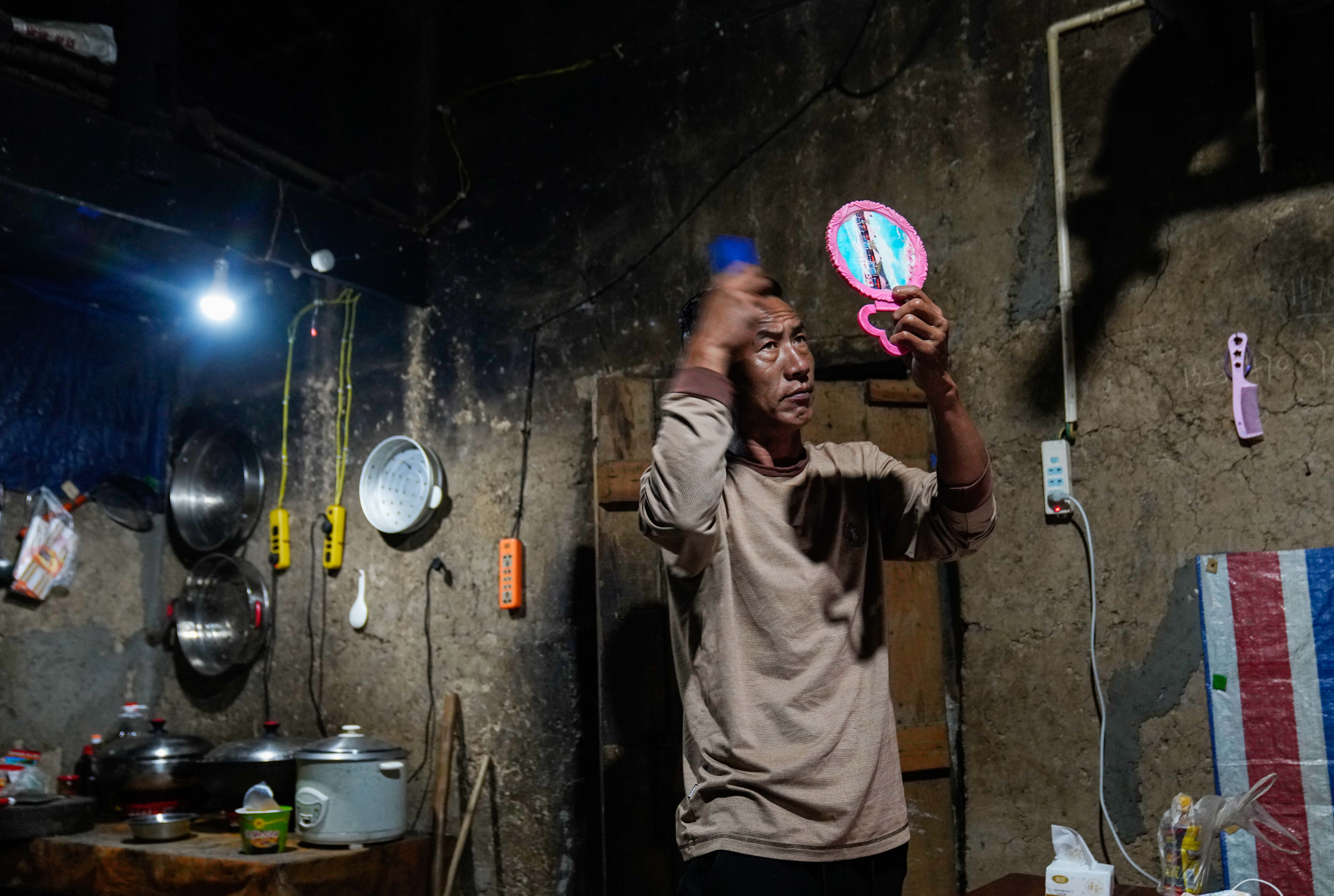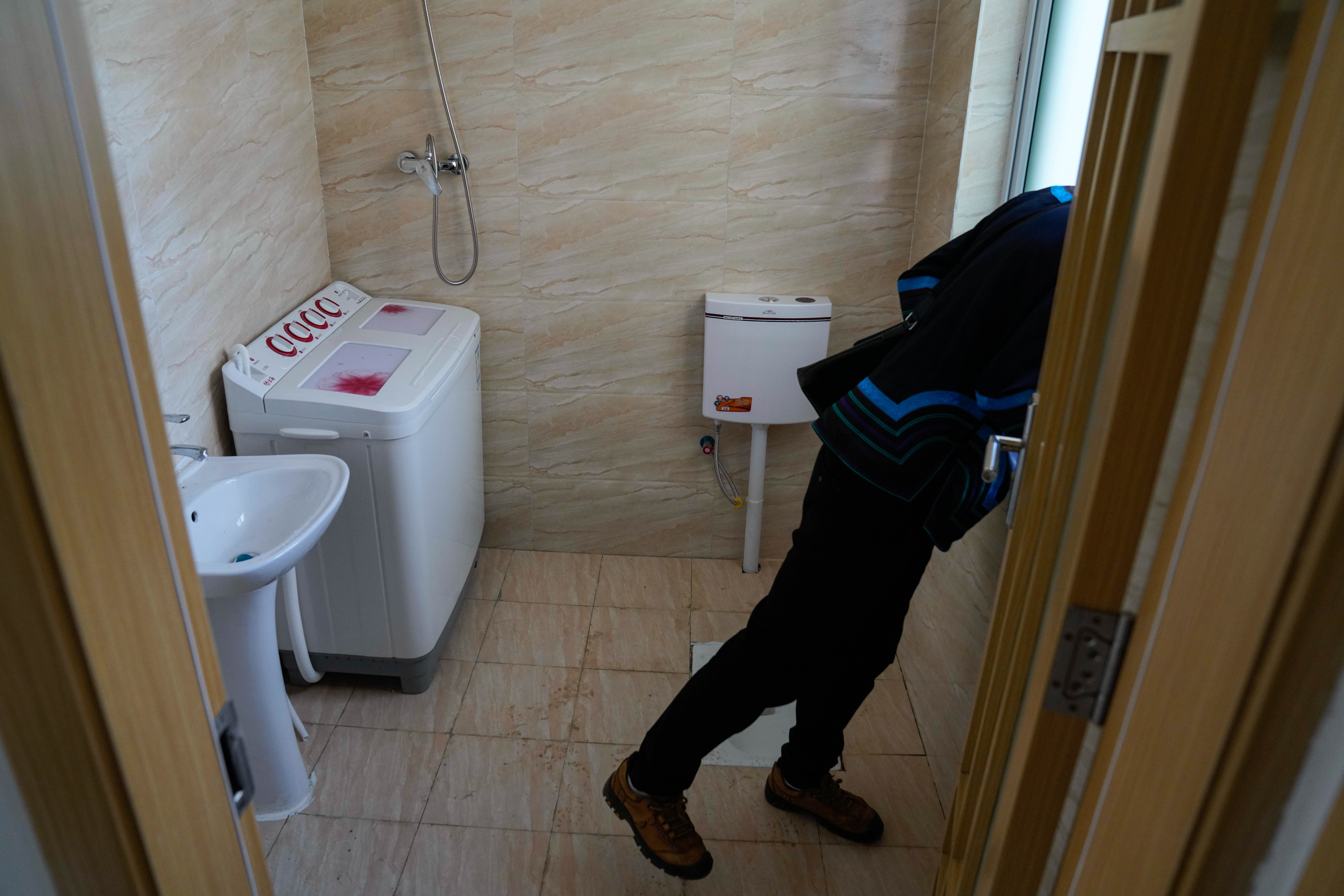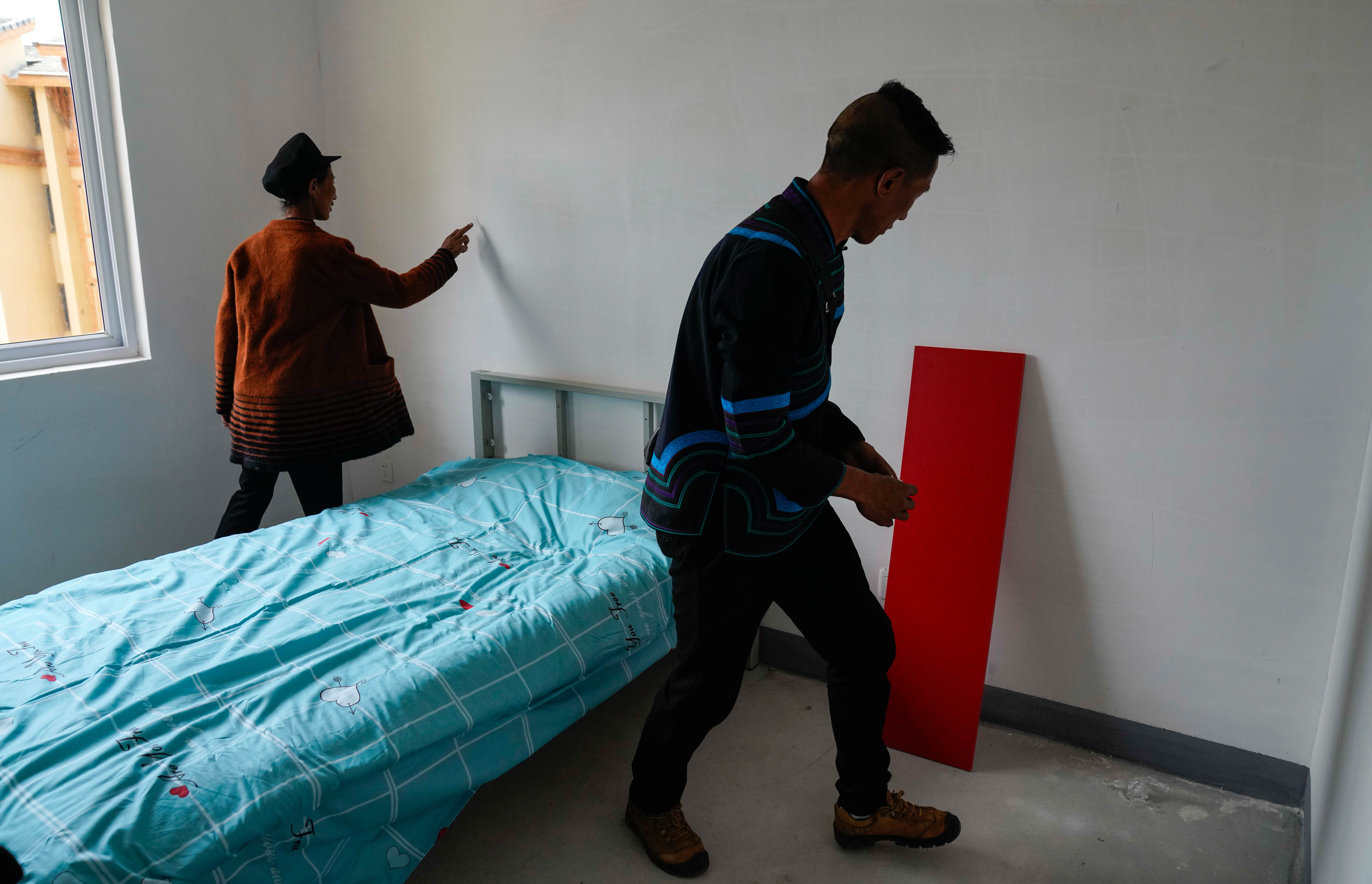 达体妻子拿手戳卧室的水泥墙面,新家还没完全收拾好,一些装家具的包装还留在房内。