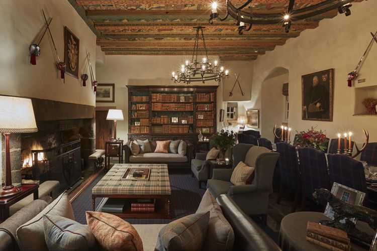 其中,位于古堡中央的主厅气势恢宏,内部陈设着传统苏格兰家具。主厅一侧是嵌入式燃木壁炉,北侧是摆满古董书籍的红木书架。此外,还有两张古典风格的大沙发,并搭配鹿角烛台、吊灯和水晶酒杯等。为了讲述城堡的辉煌历史,凯瑟琳委托艺术家珍妮·梅里露,以苏格兰传统歌曲《艾尔利的邦妮家族》为主题,在天花板上绘制了精美壁画。另外,壁炉上方陈设着普利佩剑,佩剑以传统方式打造,颇具看点。