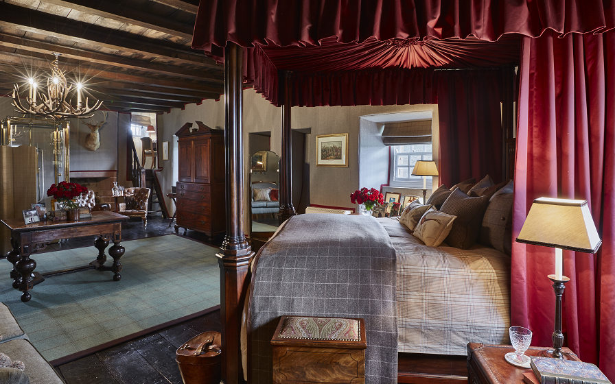 从螺旋楼梯拾级而上,来到以凯瑟琳·普尔兄弟姐妹名字命名的五间卧室,处处可见传统细节,包括城堡形衣柜、古董洗手盆以及办公桌等。设计师运用不同的元素,量身设计每间卧室,通过各种古老物件,再现19世纪富裕英国家庭的生活方式。其中,Laird’s Room是古堡中最为奢华的一间卧室,设有一张特大号四柱床,垂挂着蔓越莓色的丝绸幔帐,床边摆着一张大沙发,墙壁以英国羊毛织物装饰……另外几间卧室,有的以粗花呢面料装饰,搭配木制古董家具与真皮扶手椅;有的运用浓郁的紫色调装饰,与雕花四柱床相映成趣;还有一间卧室位于城堡内僻静之处,嵌入式书柜中摆放着大量古董书籍。