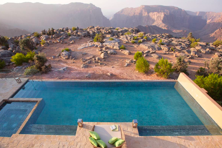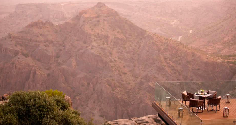 绿山屹立于阿曼苏丹国境内广阔的赛格高原,曾经是常人不易到达的高峰。这里的绿山安纳塔拉度假酒店被称为“中东地区海拔最高的五星级目的地度假酒店”。从机场出发,近两个小时的路程,沿途美景不断——茂密的枣树、古时的要塞、干枯的河床景观……酒店位于绿山大峡谷的山峦之巅,面向大峡谷,拉开窗帘,眼前便是壮观的悬崖峭壁。