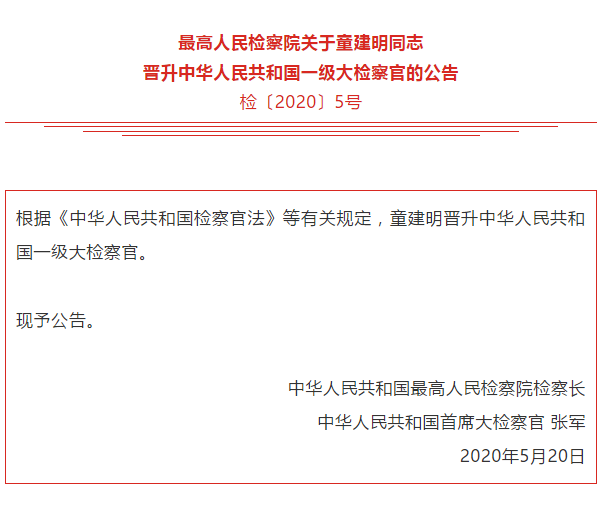 原标题:最高人民检察院关于童建明同志晋升中华人民共和国一级大检察官的公告