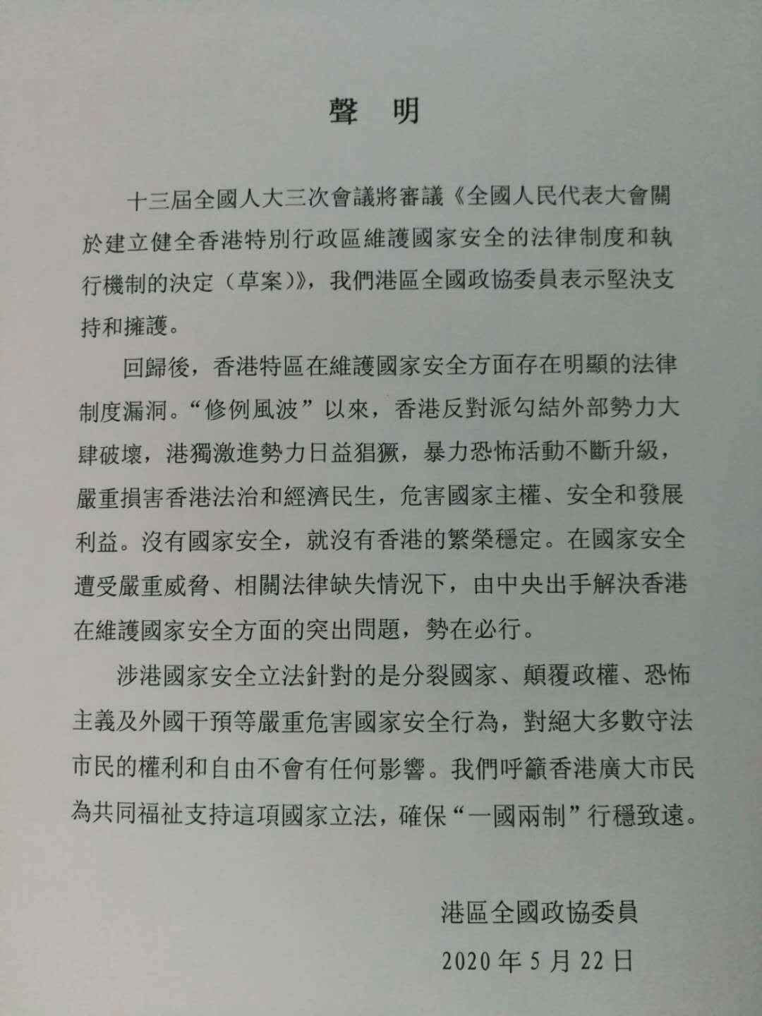 港区全国政协委员发表共同声明 坚决支持和拥护涉港草案