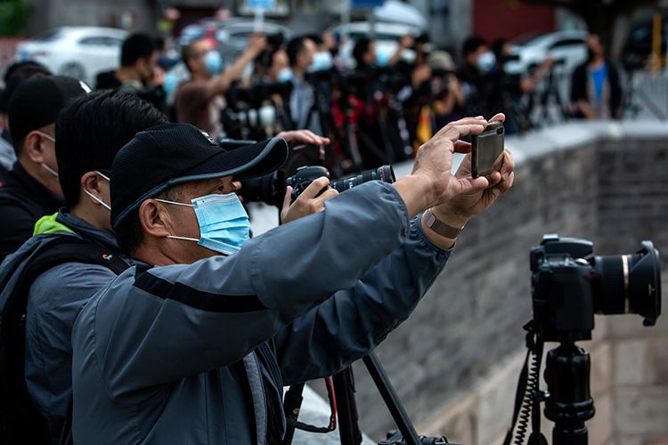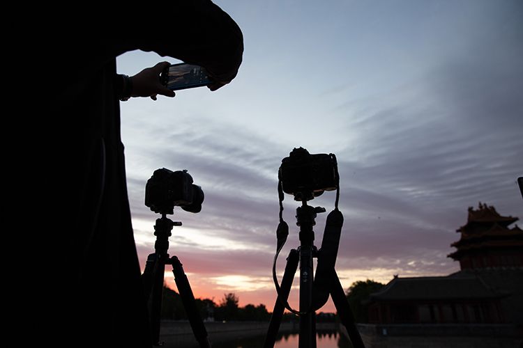 新京报讯 5月25日清晨,北京天空再次出现朝霞。凌晨4时许,近百名摄影爱好者在故宫角楼支起三脚架,等待拍摄日出前的朝霞。