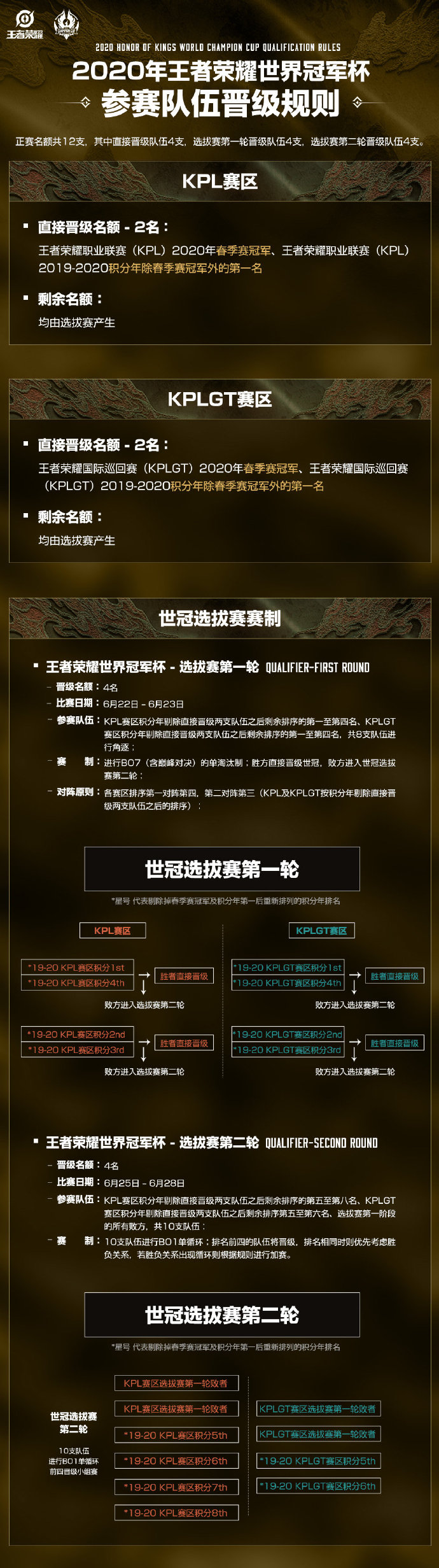 2020年王者荣耀世界冠军杯,正赛名额共12个,其中4支战队依靠联赛直接晋级,分别为KPL(王者荣耀职业联赛)赛区的春季赛冠军和2019-2020积分年除春季赛冠军外的第一名,KPLGT(王者荣耀国际巡回赛)赛区2020年春季赛冠军和2019-2020积分年除春季赛冠军外的第一名。