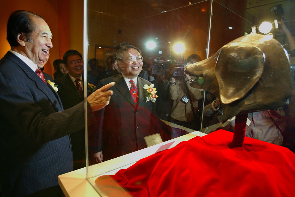 2004年1月9日,香港文化博物馆,何鸿燊在秘书的陪伴下参观圆明园十二铜兽首之四的展览。
