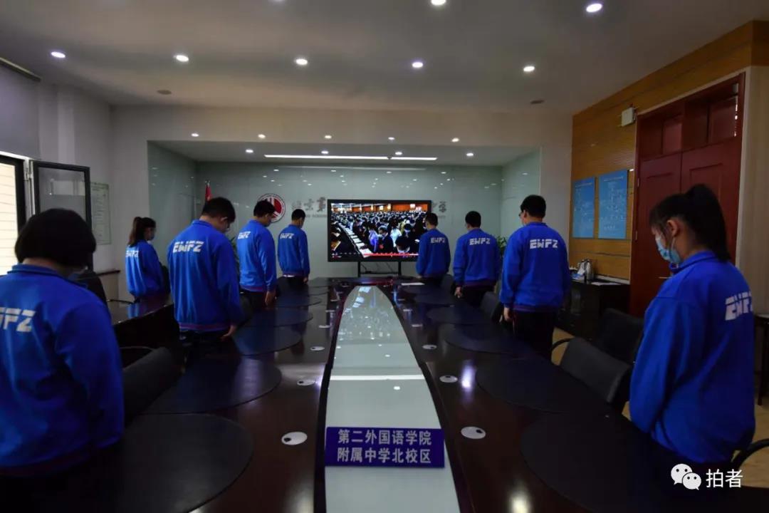 △ 5月22日,观看第十三届全国人民代表大会第三次会议开幕会直播过程中,北京第二外国语学院附属中学学生向新冠肺炎疫情牺牲烈士和逝世同胞默哀。摄影/新京报记者李木易