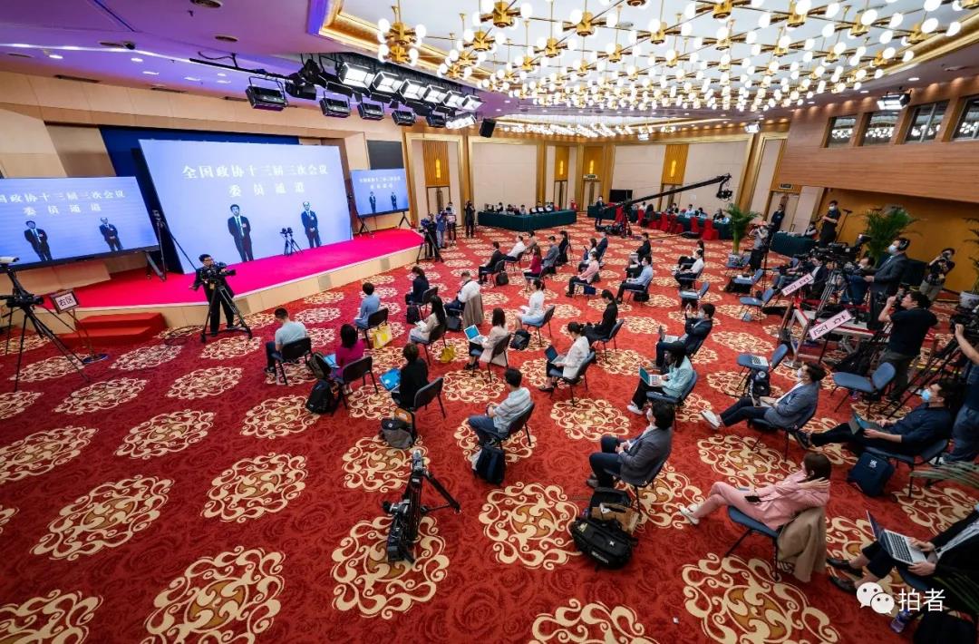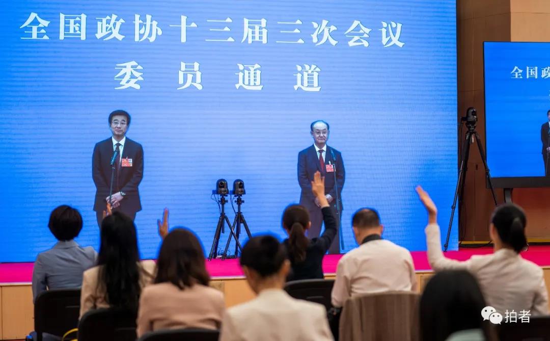 △ 5月21日下午,全国政协十三届三次会议开幕会前,首场委员通道开启,记者通过网络视频提问。摄影/新京报记者陶冉