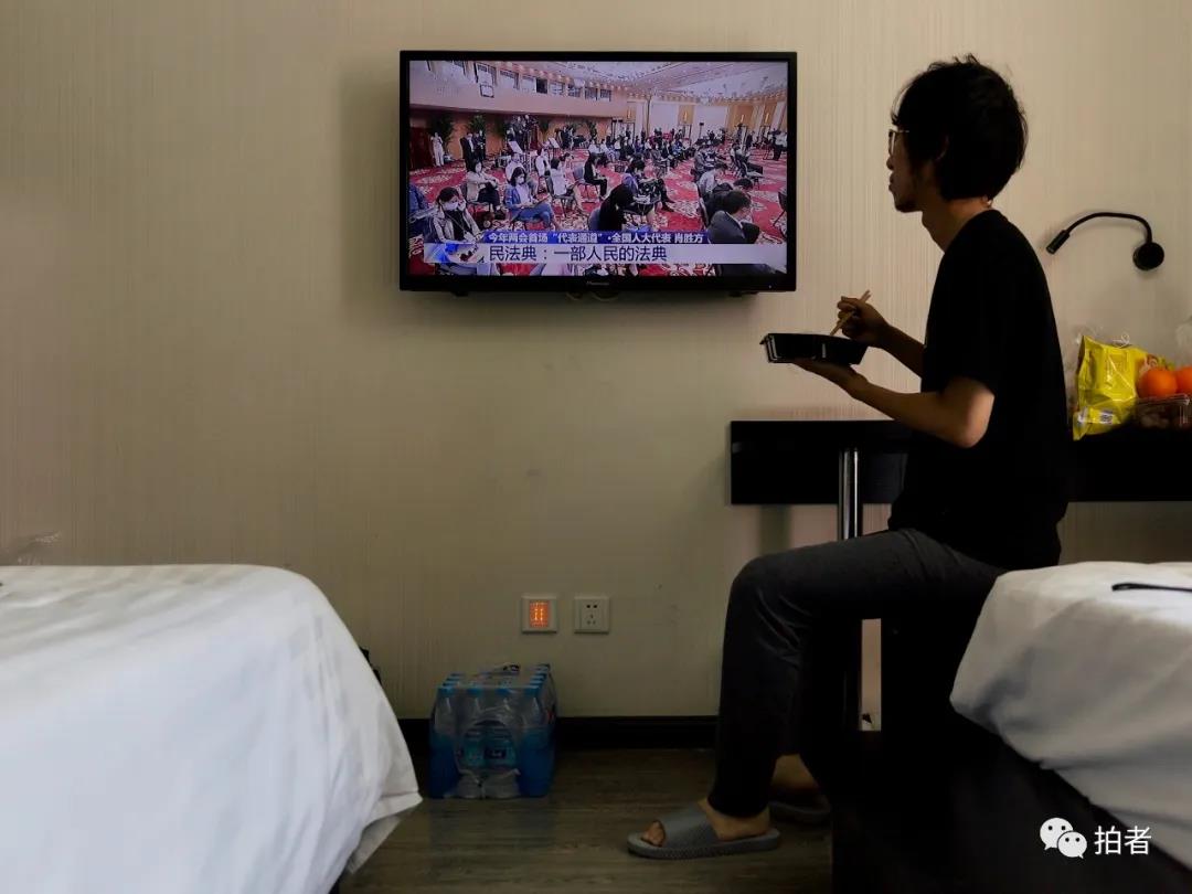 △ 5月22日,北京海淀区一集中医学观察点,男子在观看第十三届全国人民代表大会第三次会议开幕会。摄影/新京报记者郑新洽