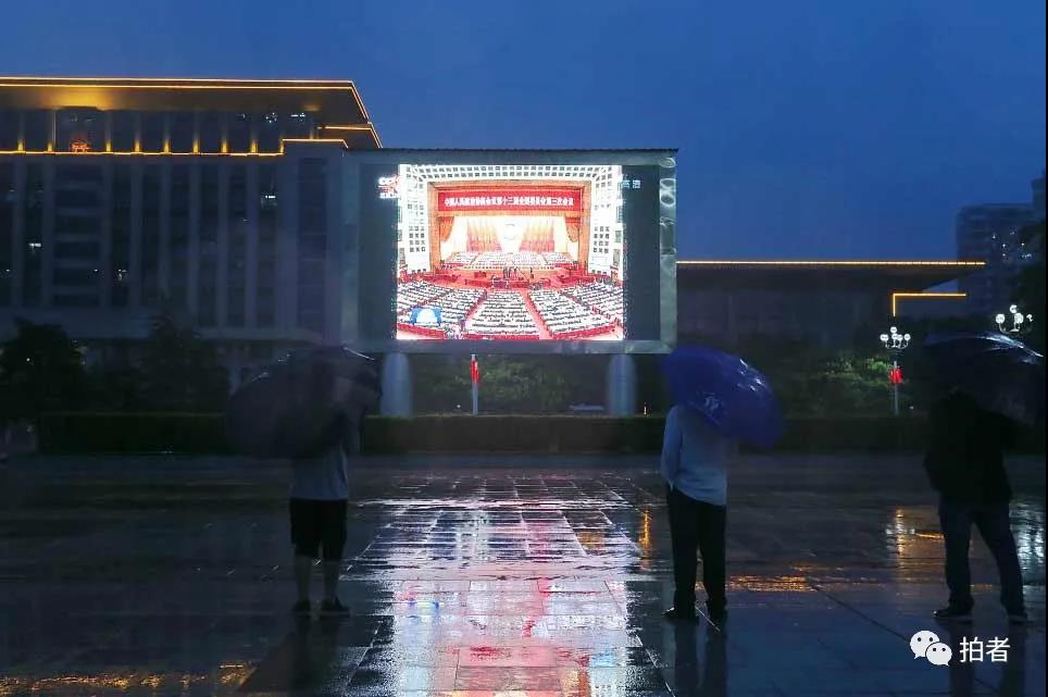 △ 5月21日,江西省抚州市金溪县锦绣文化广场,市民在雨中驻足,观看全国政协十三届三次会议开幕会相关画面。图源:人民视觉