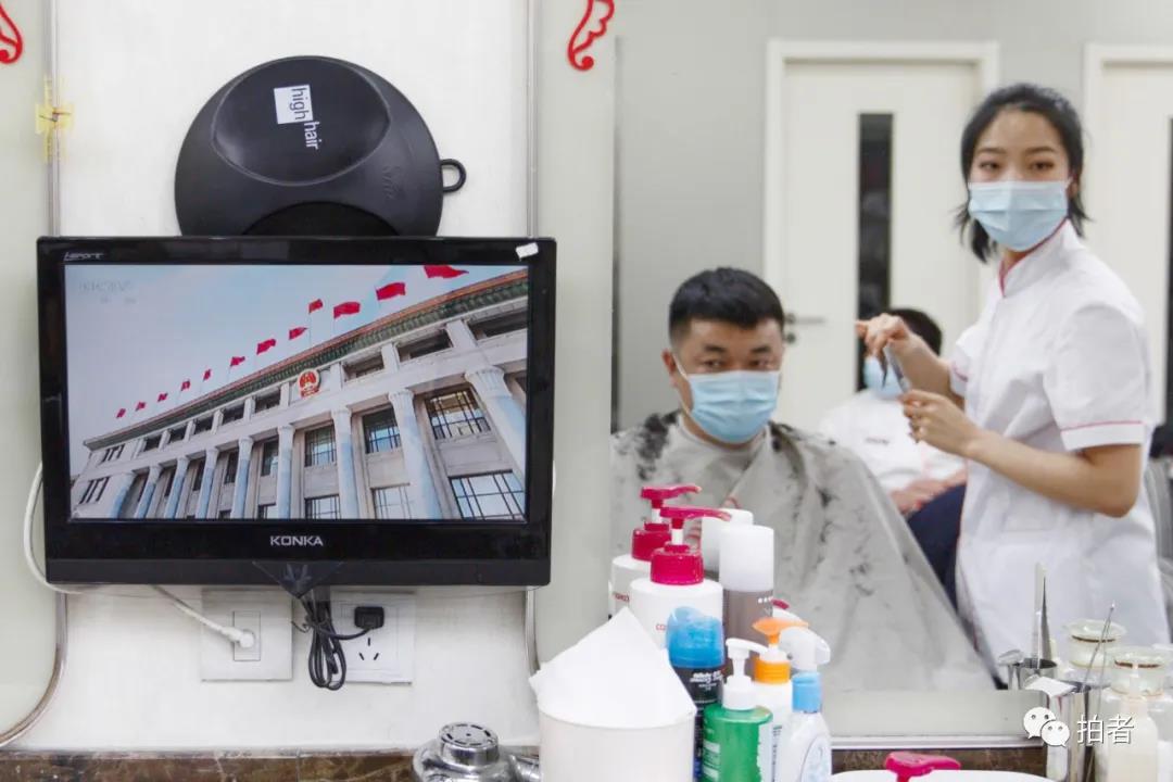 △ 5月28日下午,北京四联美发(王府井店)内,顾客边理发边观看第十三届全国人民代表大会第三次会议闭幕会直播。摄影/新京报记者李凯祥