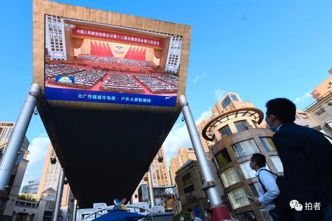 △ 5月26日,北京朝阳区,一处户外大屏幕滚动播放2020年全国两会的相关信息。图源:人民视觉