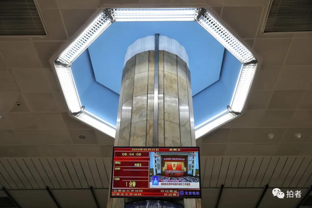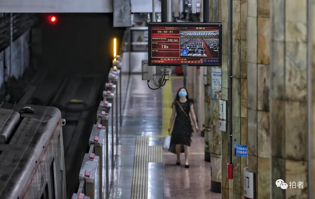 △ 5月22日9时许,北京建国门地铁站,站台屏幕上正直播第十三届全国人民代表大会第三次会议开幕会。摄影/新京报记者薛珺