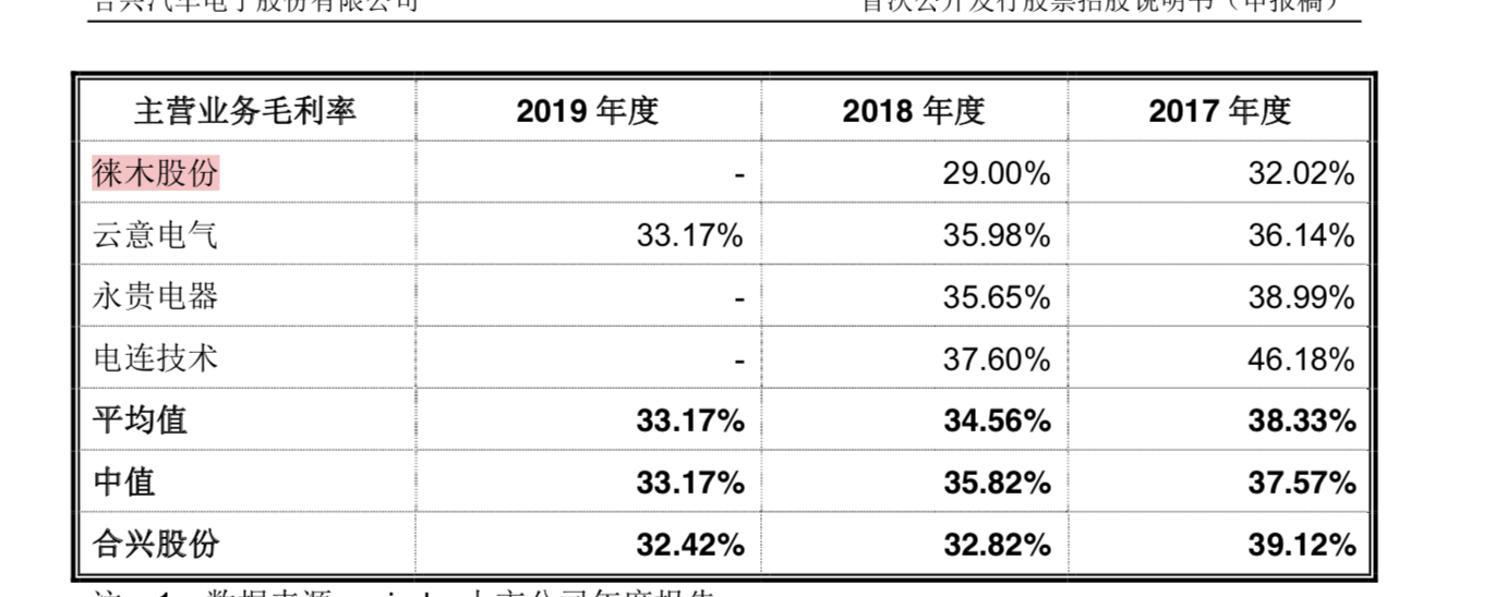 公司毛利率也在锐减。2017年-2019年,合兴股份综合毛利率分别为 37.05%、30.56%和 30.10%,申报稿中公司表示,受下游汽车行业气候原因,加之原材料价格上升等因素影响,2018年-2019年同行业汽车电子毛利率普遍有所下滑。