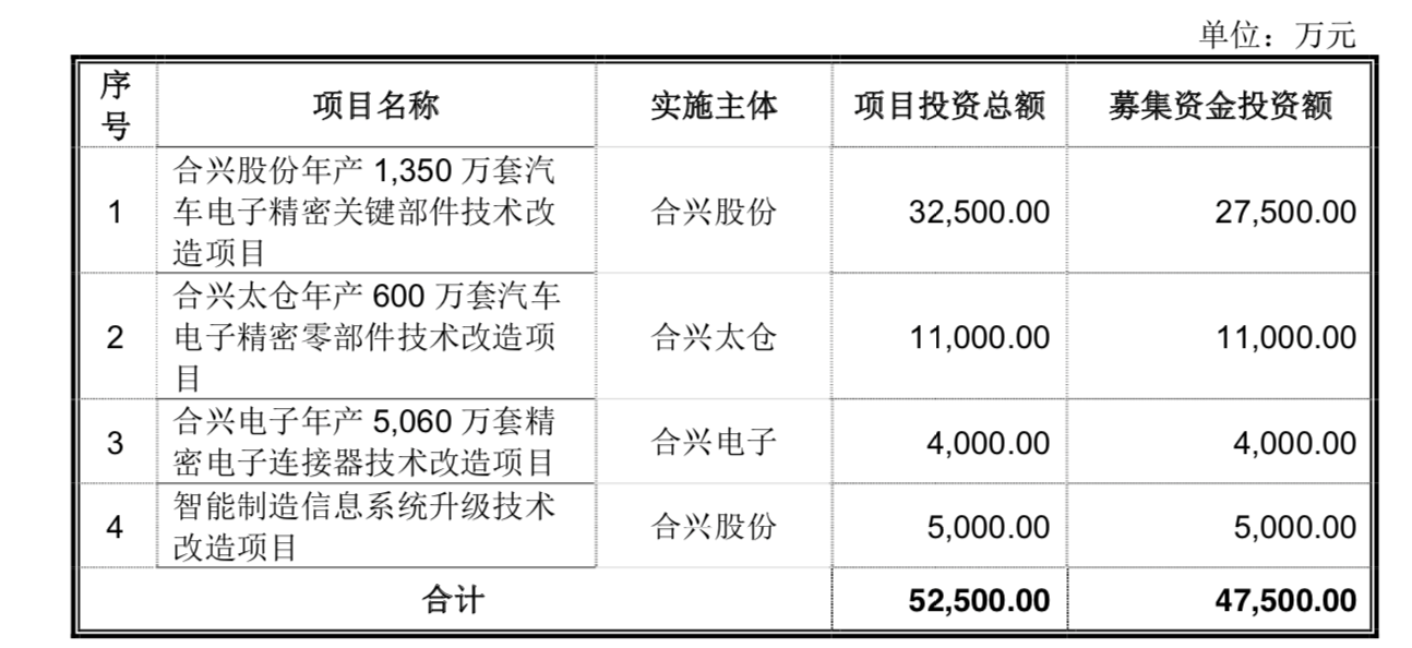 招股书显示,合兴股份本次IPO募集资金主要用途为几大电子有关的零部件技术改造及技术升级项目。项目共计四个,总投资5.25亿元,其中,使用募集资金投入4.75亿元,差额部分由公司自有资金补上。