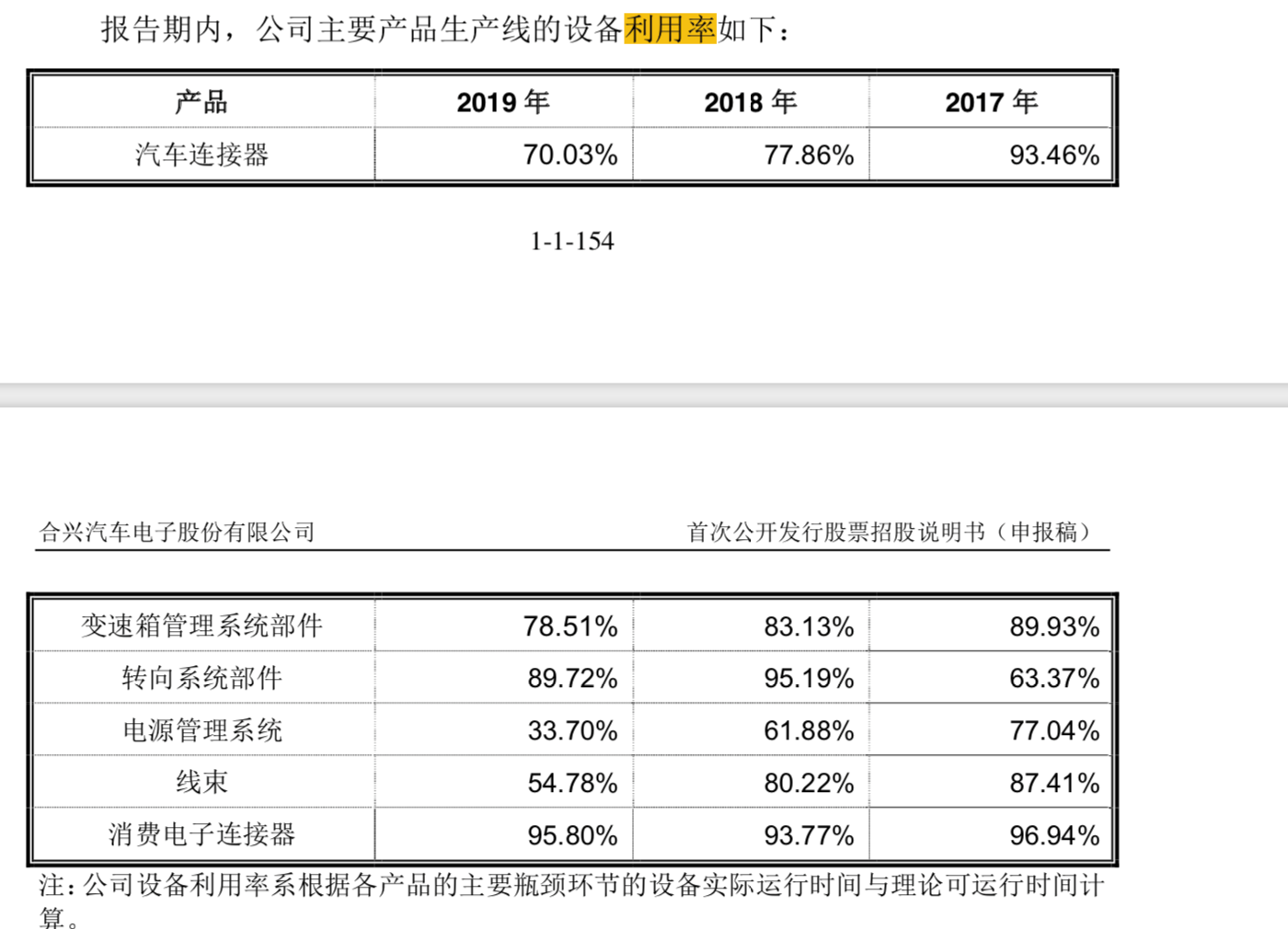 招股书中解释,2018年,主要产品产能利用率下滑主要系公司扩建更新生产线以及2018年下半年度订单量下降所致。2019年,受汽车行业景气度下降及客户需求下降影响,公司部分汽车电子产品的设备利用率继续显著下降。
