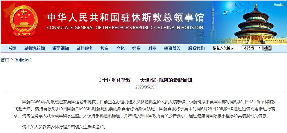 新京报快讯 据中国驻休斯敦总领馆官网消息,国航CA564临时航班已获美国运输部批复,目前正在办理机组人员及随机医护人员入境手续。该航班拟于美国中部时间5月31日13:10由休斯敦飞赴天津。请持有原5月19日国航CA996临时航班机票的乘客考虑转乘该航班,国航客服将于美中时间5月28日20时陆续通过短信或电话进行确认。请各位购票人及未成年留学生监护人保持手机通讯畅通,并严格按照中国政府有关公告要求,通过健康码国际版小程序如实填报相关信息。