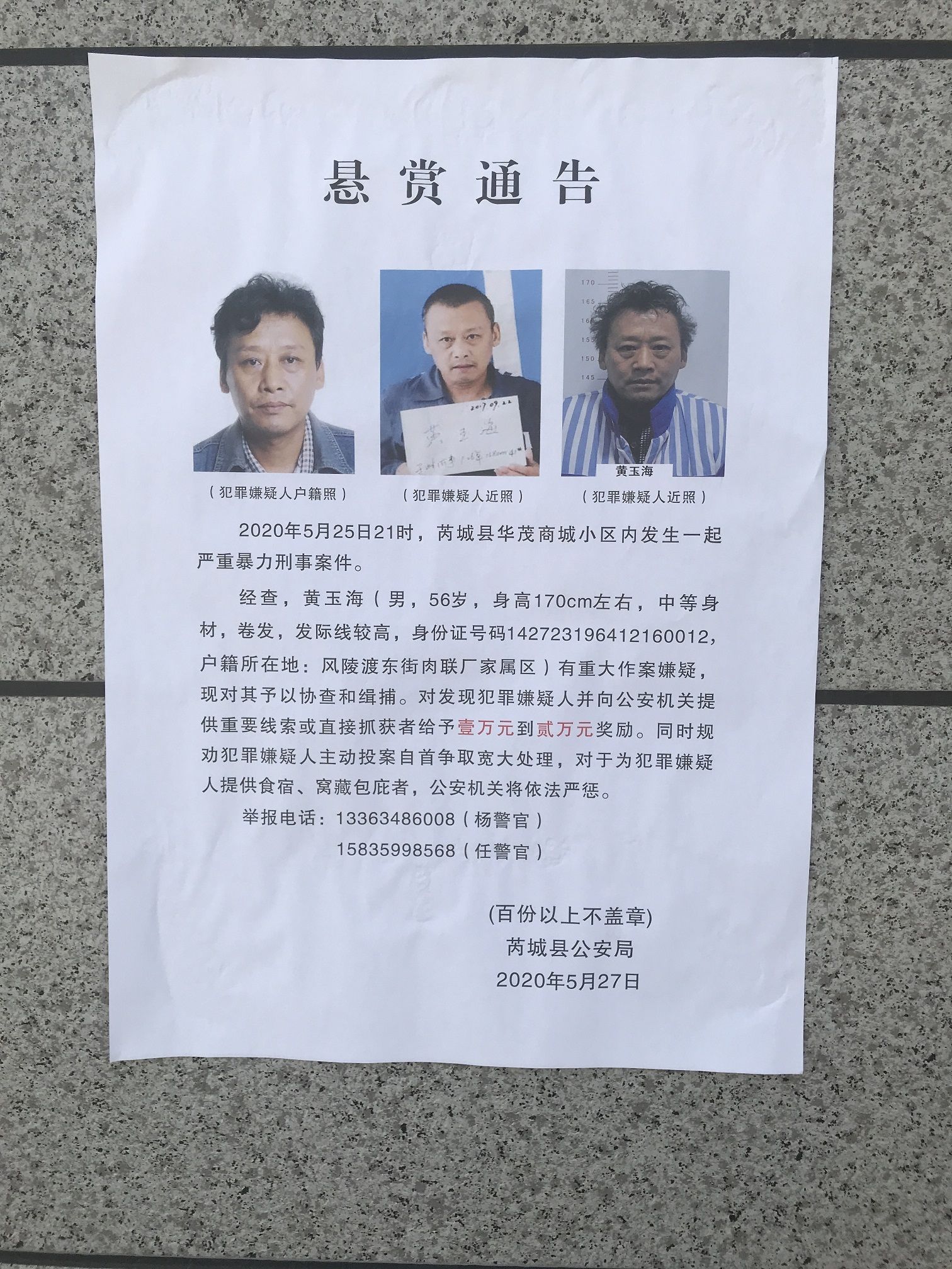 新京报讯(记者 张建斌 吴荣奎)5月25日晚,山西运城芮城县副县长姚康宁回家途中被人用刀刺伤。芮城警方称,56岁的黄玉海有重大作案嫌疑,已发布悬赏通告,正在全城搜捕。姚康宁被刺伤右臂及右胸廓,目前在家中休养。截至29日12时,嫌疑人仍未落网。