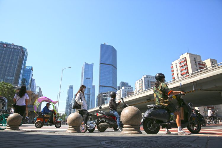 9:25,朝阳北路与东三环北路辅路路口,骑行市民等待红灯。