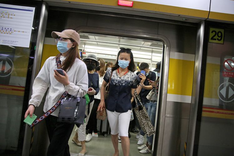 8:43,6号线花园桥地铁站,乘客从车厢走出。