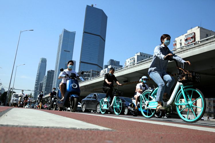 9:30,朝阳北路与东三环北路辅路路口,市民骑车通过路口。
