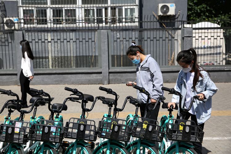 9:35,呼家楼地铁站,市民扫码解锁共享单车。