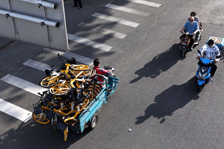 7:00,北二环,共享单车的运维人员载着共享单车朝地铁站方向驶去。
