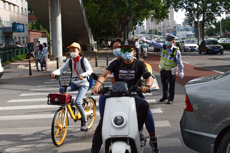 7:45,北京市海淀区实验小学,交警正在疏导交通,家长骑电动车送孩子上学。