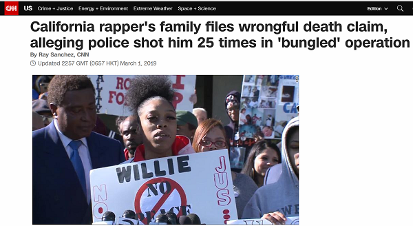 2019年3月,加利福尼亚州的6名警察对20岁的非洲裔说唱歌手威利·麦科伊的“头部、耳朵、颈部、胸部、手臂、肩膀、双手和背部”连开25枪,致其死亡。麦科伊的姐姐西蒙妮·理查德说,“警察处决了我的弟弟,他们甚至没有给他举起双手的机会。”