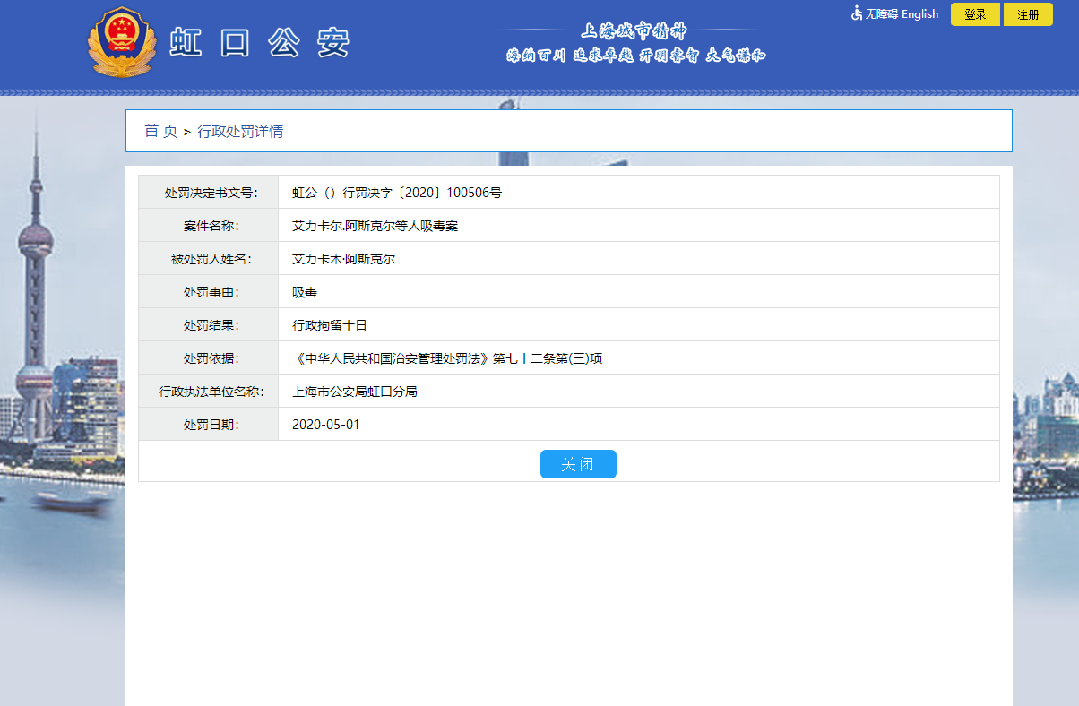 虹口公安官网显示,卡姆本名艾力卡木·阿斯克尔,于5月1日因吸毒被行拘十日。