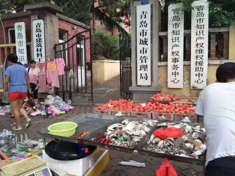 6月3日,一张图片引起热议。画面中,多个摊贩的摊位将一个机关大院的门口包围,“青岛市城市管理局”的招牌也在其中,另有“青岛市知识产权事务中心”与“青岛市知识产权维权援助中心”等单位。