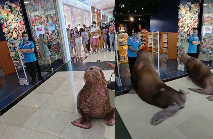 划下重点:在商场内“遛”海象。