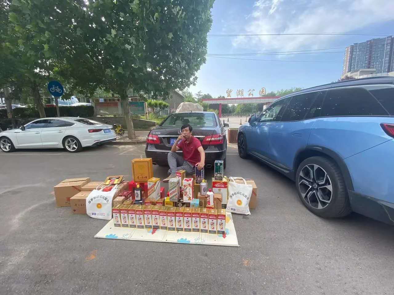 网传照片显示,一名男子在望湖公园门口摆摊,面前摆放着20余瓶茅台酒,且涉及多个品种。酒盒上白色布袋印制有“茅酷”图标以及“存茅台过亿元留念”字样。此外,男子背后停放一辆奔驰车,该车并未按标识停放在划线车位中。有网友质疑男子系摆拍。