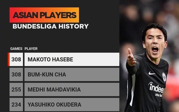 长谷部诚超越车范根,成为在德甲出场次数最多的亚洲球员。