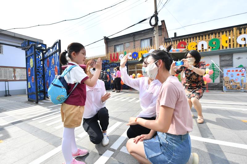 新京报讯(记者 高杨)6月8日,北京市幼儿园复园的第一天。北京市丰台区丰台第一幼儿园的老师们一早站在门口,迎接孩子们的到来。据了解,复园的第一批大班孩子报名人数已经达到100名。今日来园的小朋友分两批错峰入园,按照规定的区域进行游戏、就餐、盥洗,以防止幼儿密集,保障师幼安全。