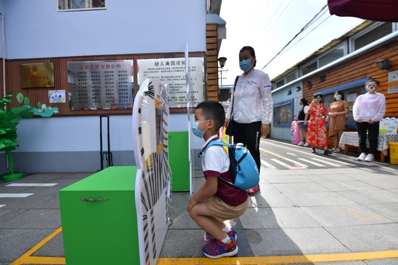 上午八点半,孩子们拉着爸爸妈妈的手陆续来到幼儿园,踩着地上的“小脚丫”标识走进幼儿园甬道。在“小斑马”体温测试仪前进行面部识别,体温合格后,走到卫生保健老师那里,再接受手口检查。保健老师会询问孩子们的近期身体情况。幼儿园还设置了 “长颈鹿”手部消毒机,孩子们伸手和“长颈鹿”打招呼的时候就可以完成手部消毒。经过“测温——手部检查——口腔检查——手部消毒”四步,孩子们才可进入幼儿园。