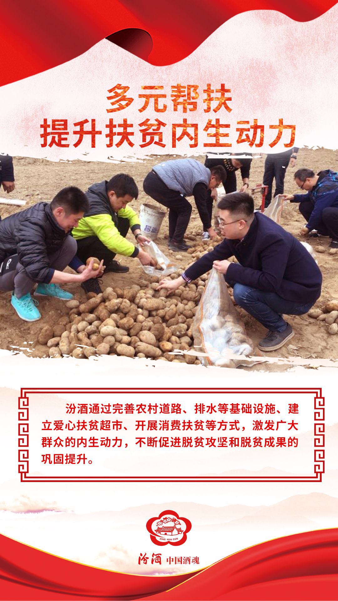 2015年,汾酒派出5名“第一书记”分别进驻马坊镇5个贫困村,后又增派12名工作队员驻村进行精准帮扶,完善农村基础设施,实施特色产业扶贫工程等各项惠民项目,强化帮扶村的致富内生动力。