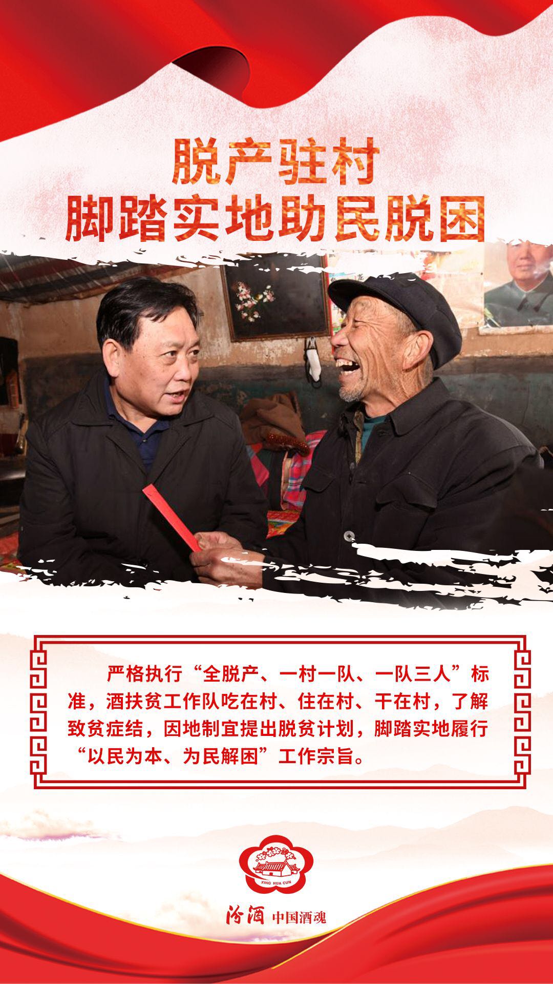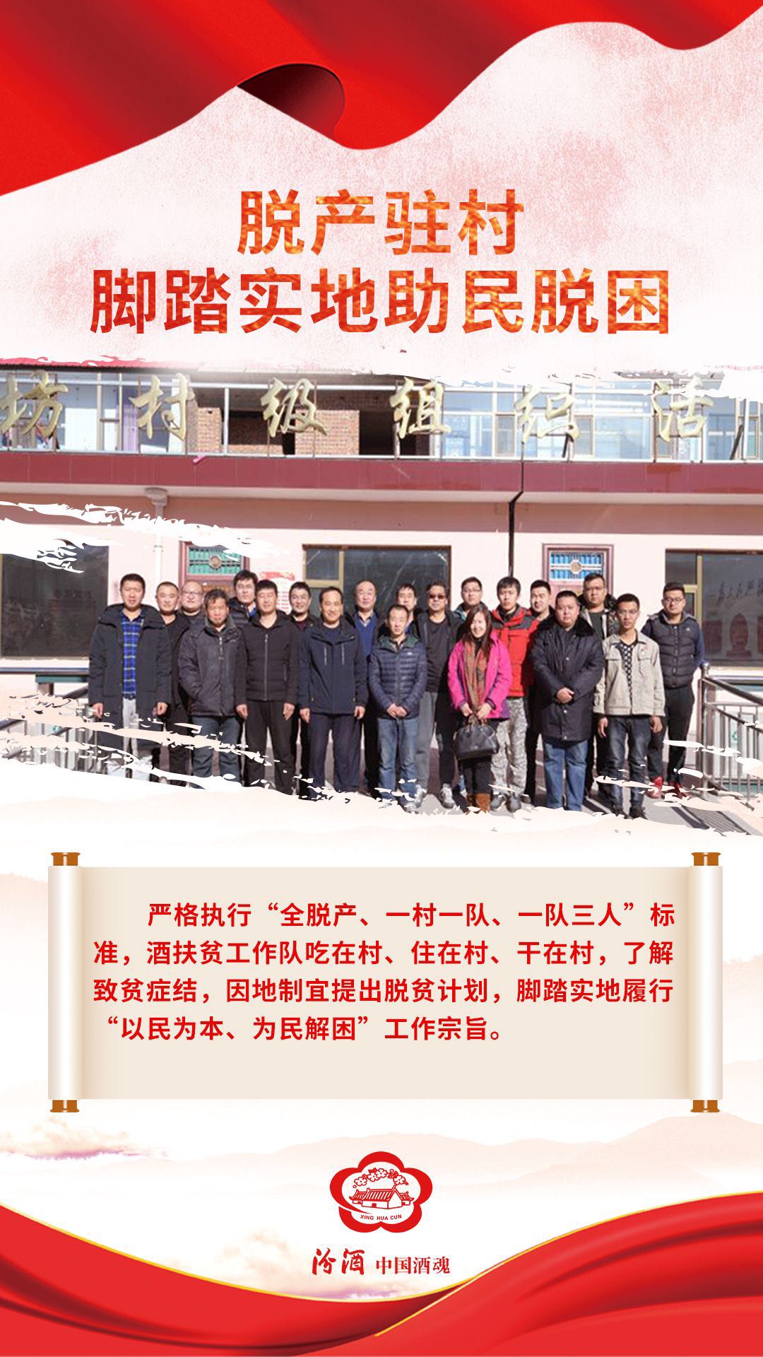 2016年12月,汾酒在派驻“第一书记”基础上成立新一届扶贫工作队,进一步强化精准扶贫、精准帮扶意识,从帮扶乡镇转变为帮扶贫困村。在马坊镇的马坊、树林则、西沟、赤街和赤街会5个贫困村,汾酒先后选派了40余人组建了5个驻村工作队,全脱产驻村开展帮扶工作;公司共派出193名党员干部,对定点帮扶的五个贫困村964户、4632人贫困人口实现了结对帮扶全覆盖,于2018年年底五村全部如期脱贫摘帽,使公司在方山的定点帮扶工作取得了显著的成效。