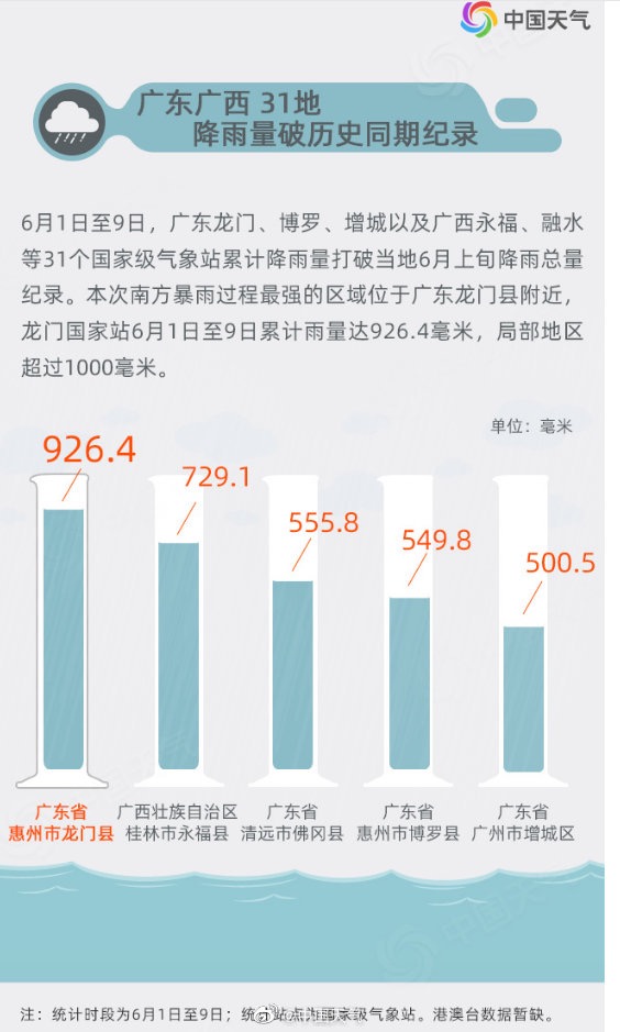 中国天气网数据显示,6月1日至9日,广东龙门、博罗、增城以及广西永福、融水等31个国家级气象站累计降雨量打破当地6月上旬降雨总量纪录,桂林阳朔一天下完北京大半年的雨。