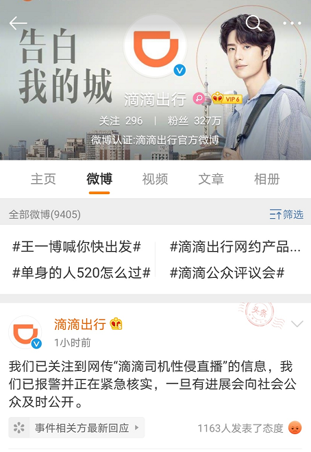 6月11日,滴滴出行官方微博就此事回应称,已关注到网传“滴滴司机性侵直播”信息,已报警并正在紧急核实。