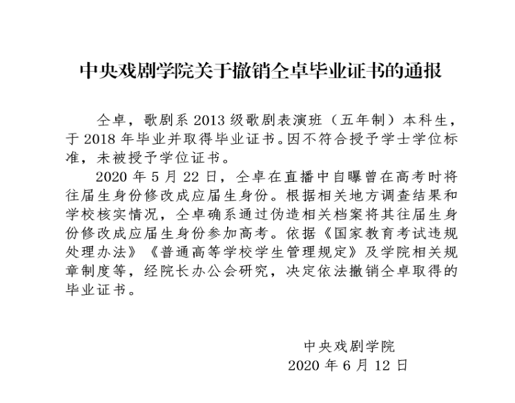 新京报快讯 据中央戏剧学院网站消息,6月12日,中央戏剧学院发布关于撤销仝卓毕业证书的通报。
