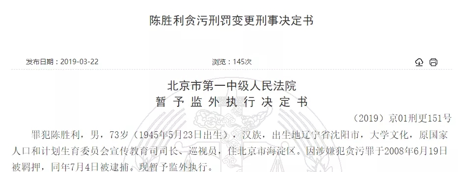 北京市一中院在裁定书中称:罪犯陈胜利,74岁(1945年5月23日出生),出生地辽宁省沈阳市,大学文化,原国家人口和计划生育委员会宣传教育司司长、巡视员,住北京市海淀区。因涉嫌犯贪污罪于2008年6月19日被羁押,同年7月4日被逮捕。现暂予监外执行。
