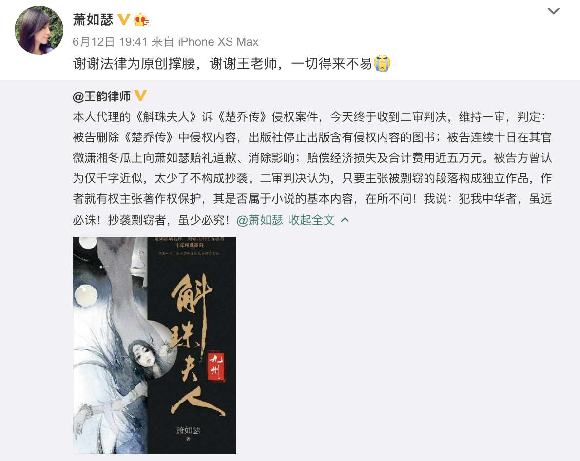 新京报讯 6月12日,《斛珠夫人》作者萧如瑟转发了王韵律师的微博,公布了《斛珠夫人》诉《楚乔传》侵权案件的二审判决:维持一审,判定被告删除《楚乔传》中侵权内容,出版社停止出版含有侵权内容的图书;被告连续十日在其官微潇湘冬瓜上向萧如瑟赔礼道歉、消除影响;赔偿经济损失及合计费用近五万元。